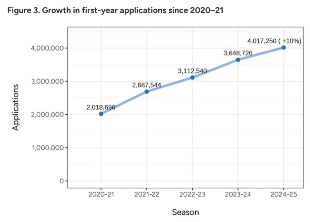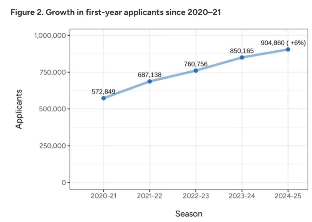 据CA统计,截至2024年11月1日,2024-2025申请季,已有904,860名学生通过Common App递交了4,017,250份新生申请材料。