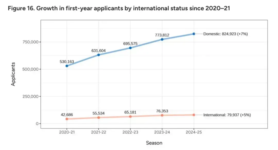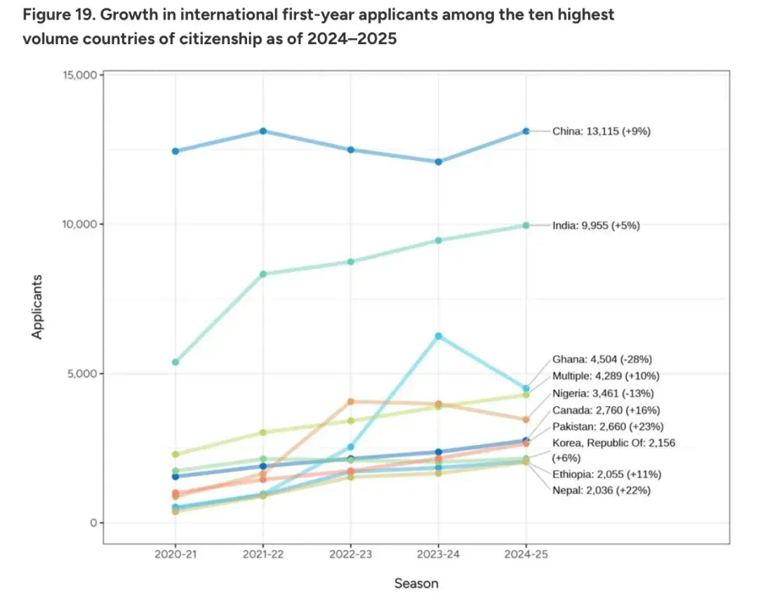 国际生的增长幅度要小于美国本土学生,这也是自2019年以来,首次国际申请者的增长率低于美国本土申请者的情况。
