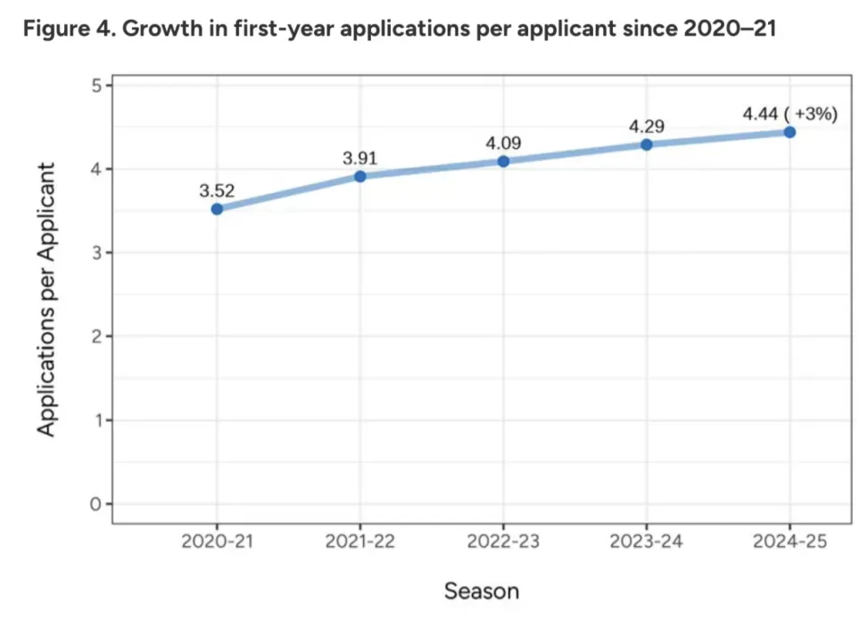 今年每位学生平均申请了4.44所院校,比去年(4.29所)有所增加。