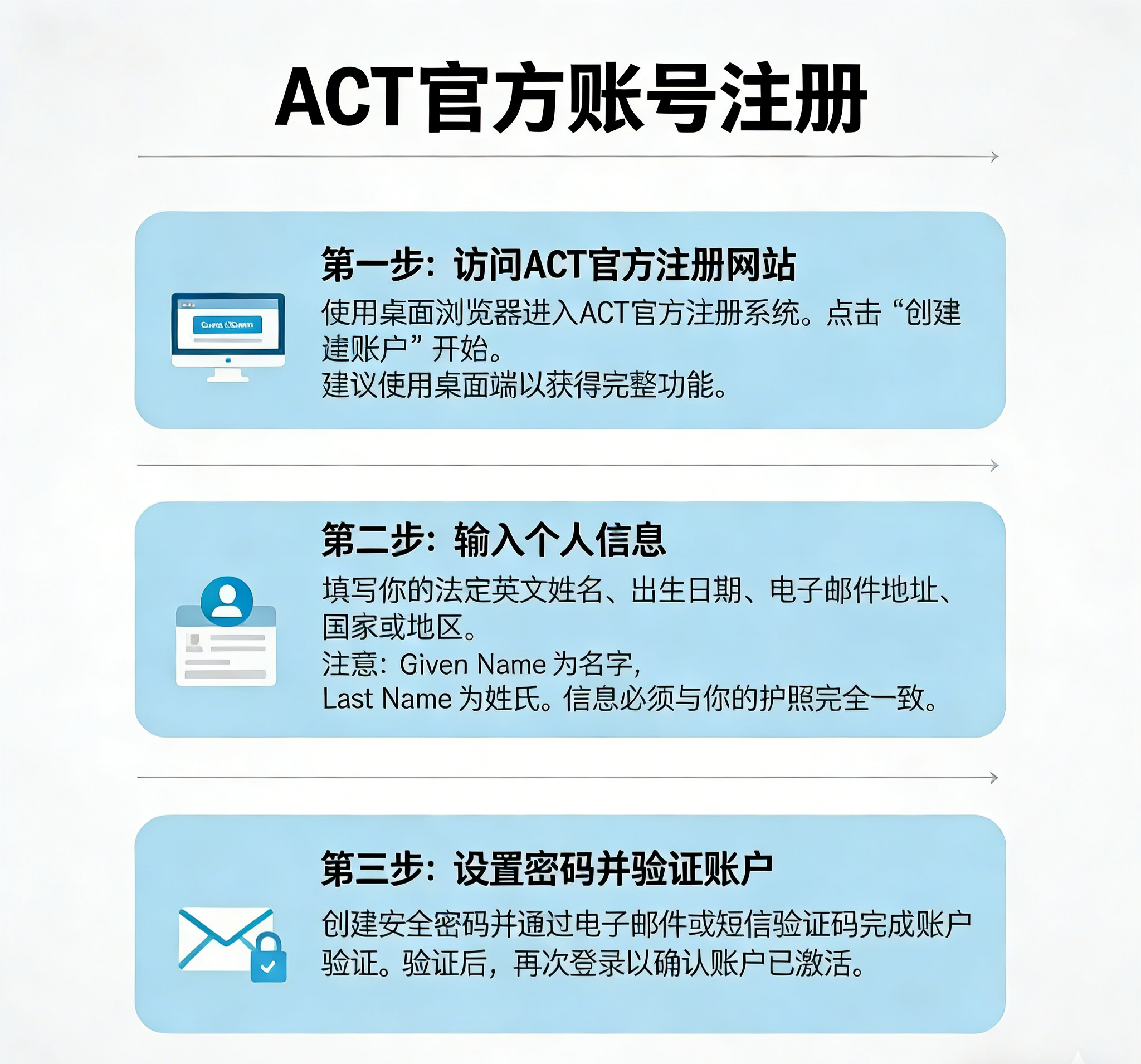 ACT所有考试报名、信息修改、成绩查询,都只能通过官方账号完成。因此,注册账号这一步必须一次到位。