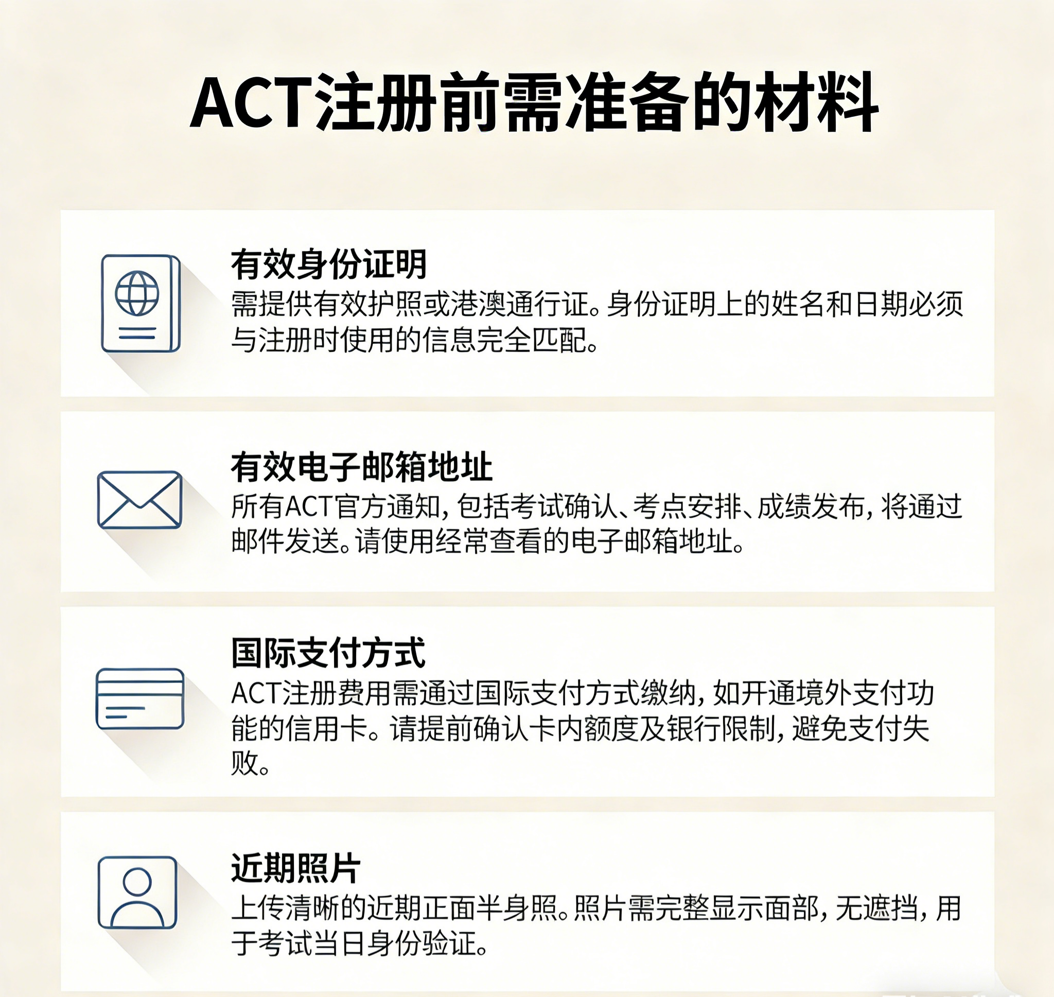 ACT 报名所填写的姓名必须与护照或港澳通行证完全一致,包括顺序、空格与大小写。哪怕只是多一个空格,也可能导致考试当天身份核验失败,无法入场。