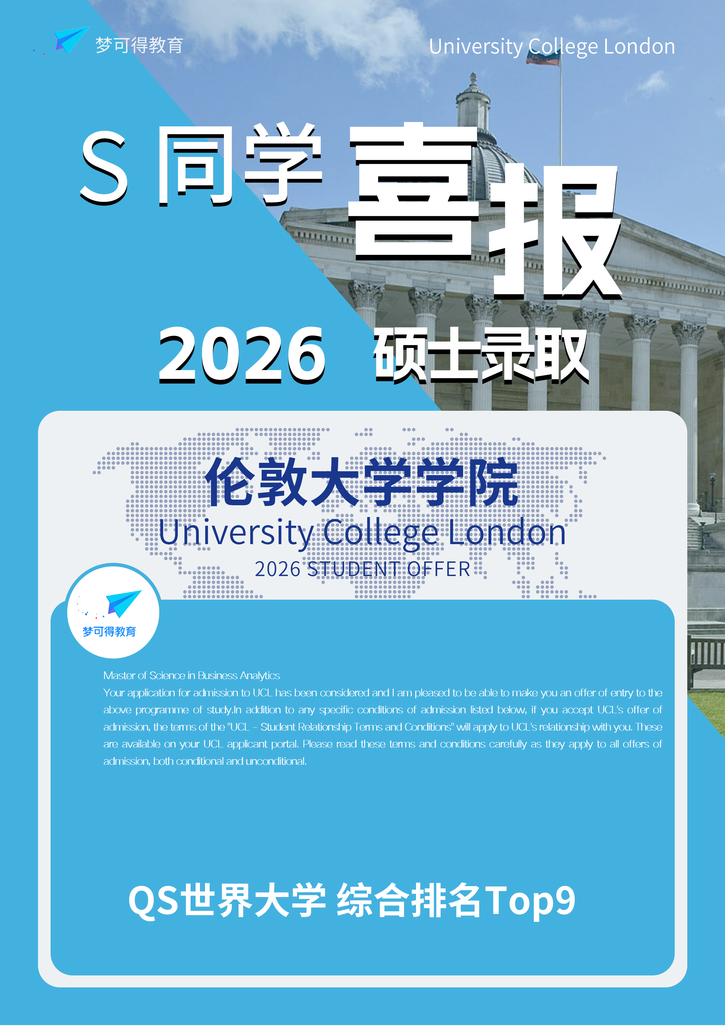 当她在大学图书馆打开邮箱,看到来自UCL、爱丁堡大学以及曼彻斯特大学的录取通知时,仍然难以平复内心的激动。曾经那个连奖学金评选都未能入围的普通学生,通过两年的持续努力,最终站在了世界一流高校的门槛前。回顾这段经历,她最庆幸的是没有在被忽视时选择放弃,也正是梦可得教育的系统规划,让她得以接触到更广阔的国际资源。从数据驱动的科研项目,到跨国背景下的实践经验,她逐渐用真实成果打破了原有的局限。对于未来,她希望在UCL继续深入研究全球跨境电商与数据分析领域,把这段“逆袭”的经历延续下去,让成长不止于一次录取,而成为长期积累的起点。