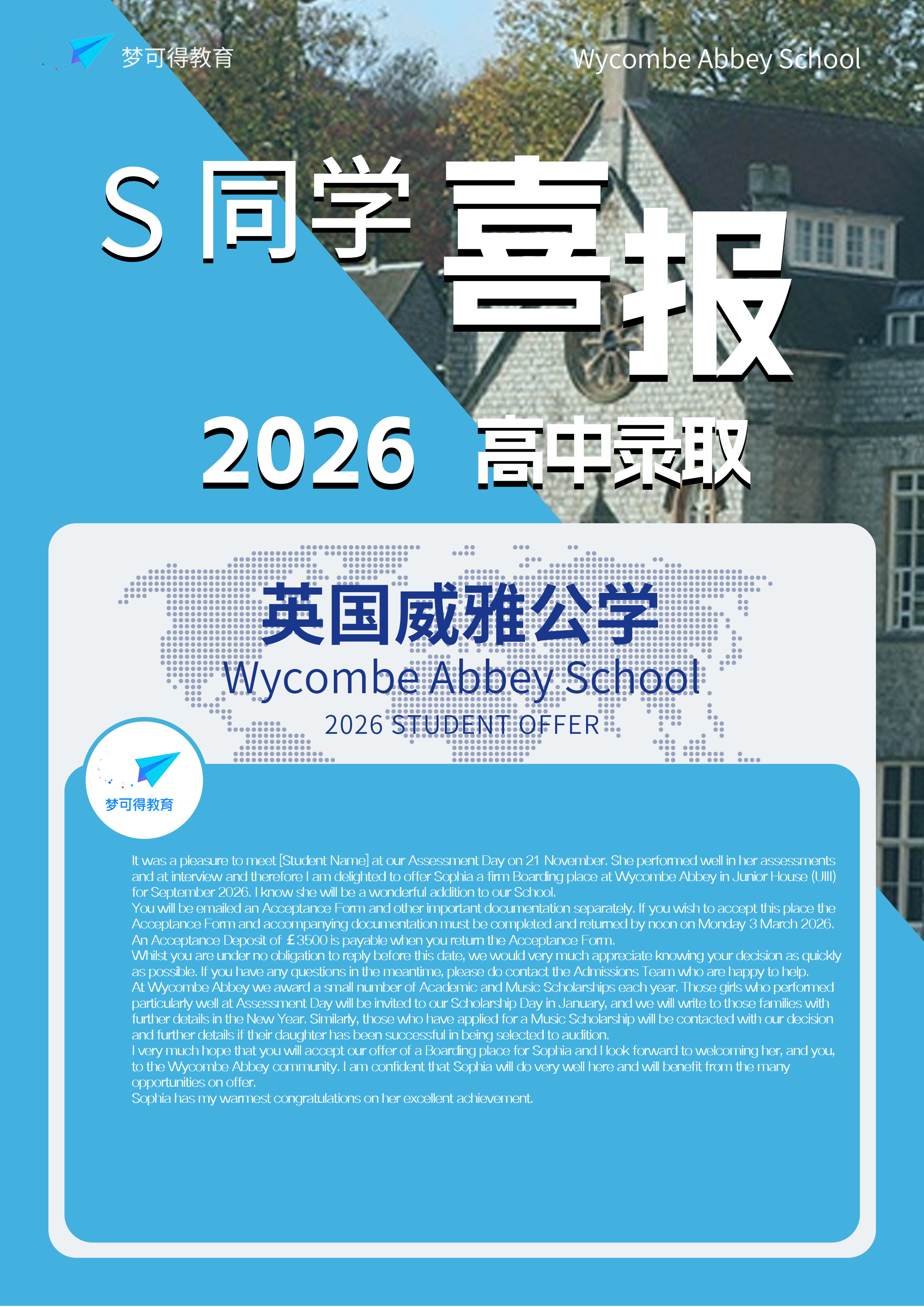 当我真正收到来自 Wycombe Abbey School Roedean School offer时,其实有一瞬间是不太真实的。那段时间的努力、紧张和期待,好像一下子都有了回应。在和家人认真讨论之后,我最终选择了威雅公学。这个决定不仅是因为它的学术实力,更是因为我在夏校和整个申请过程中,逐渐确认了自己适合那样的学习氛围——安静但有力量,克制却充满追求。